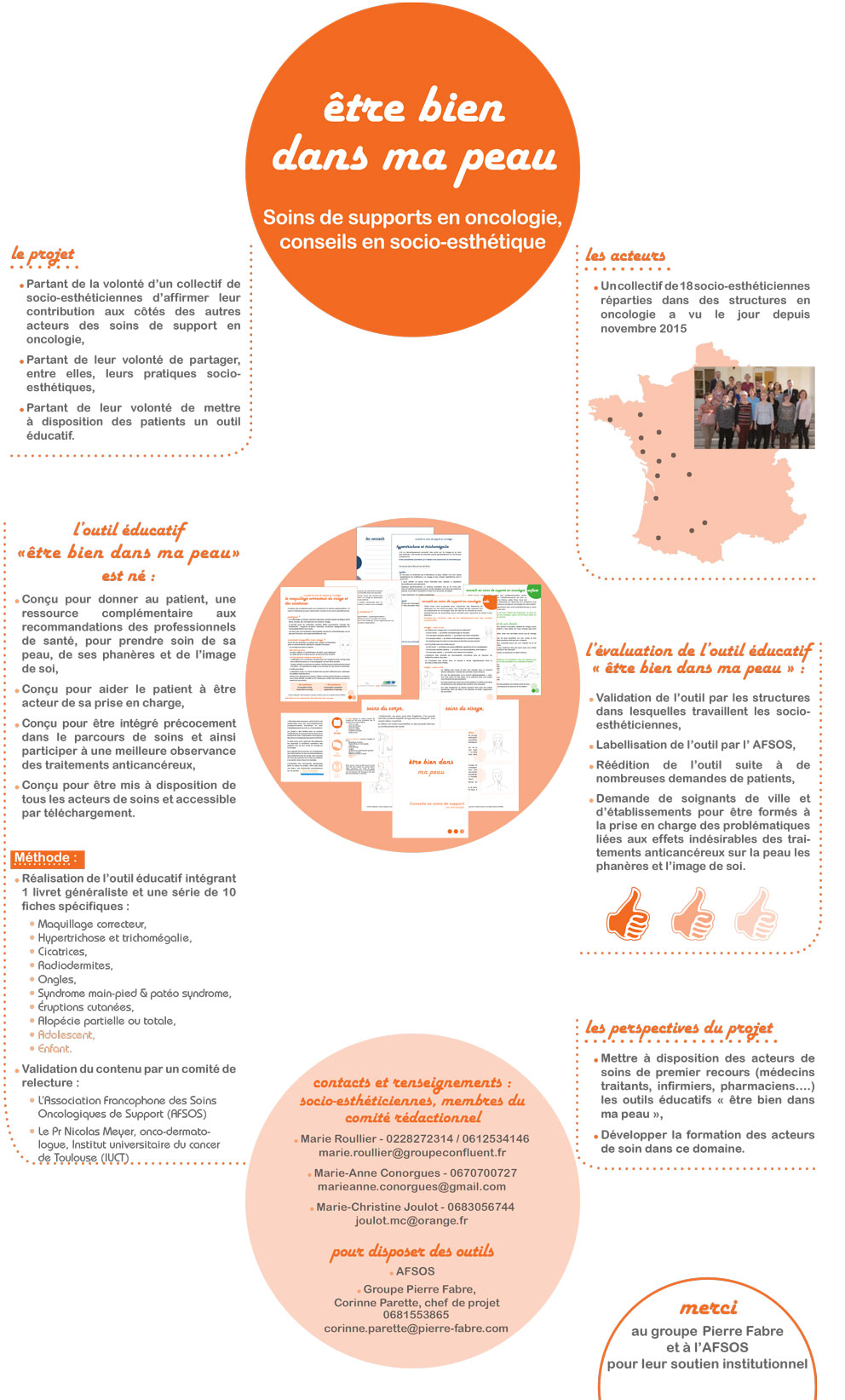 L’appel à communication sur le projet des 18 socio-esthéticiennes avec Pierre Fabre retenu sous forme de poster nous permettra également de présenter l’outil éducatif élaboré à destinations des patient(e)s et de leur entourage.